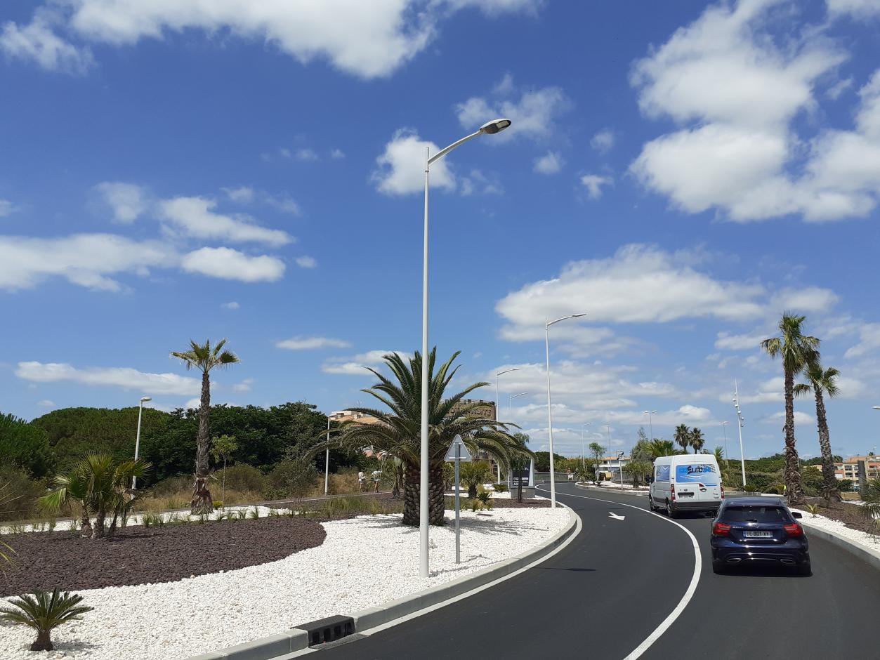 Orkane LED luminaires on Mona 250 mm brackets arms on cylindro-conical masts. Installation of Ornante (66), South of France.
