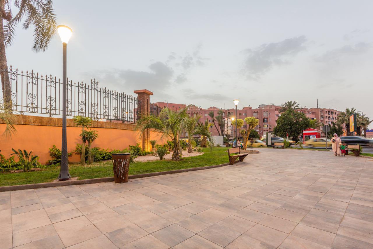 Verso luminaires on cylindrical masts with wood finish. Installation in the park of the Villa Harris in Tanger (Marrocco).