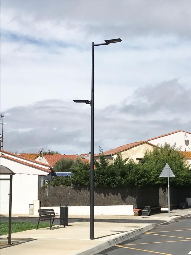 Ello lighting set on straight tube bracket arm on cylindrical-conical mast, with Ello rear light. Installation in Saint-Nazaire in Roussillon (66).